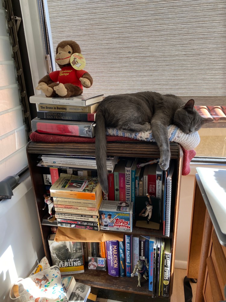 I think of this as my “possibility bookcase,” as in, I might possibly soon read the books that I have filed and stacked on its shelves. These are books that I have moved up from the larger library that my wife Erin and I have accumulated from lifetimes of reading, book collecting, and working in bookstores. My “theory” is that if I keep them next to me while I am sitting at my desk, I will feel either inspired or made guilty by their unread presence, and get to them sooner or later.